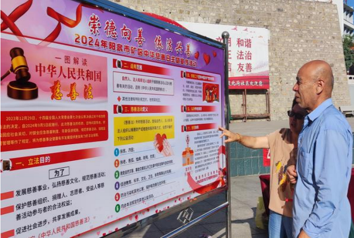 2024年9月5日是我國第九個“中華慈善日”, 也是修改后的《中華人民共和國慈善法》正式施行之日。為深入學習貫徹習近平總書記關于慈善工作的重要指示批示精神和黨的二十屆三中全會精神,廣泛動員社會公眾參與慈善事業(yè),營造崇德向善慈善氛圍,促進慈善事業(yè)高質量發(fā)展,陽泉市礦區(qū)開展以“崇德向善 依法興善”為主題的 “中華慈善日”系列宣傳活動。